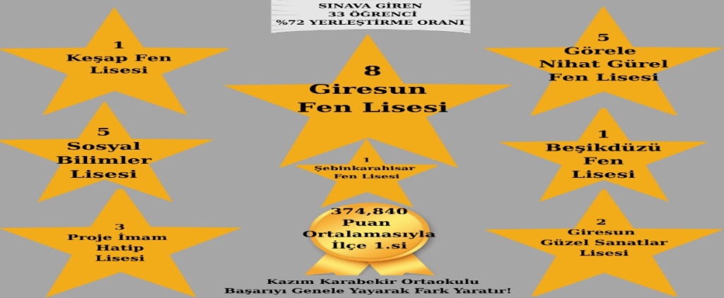 2025 Liselere Geçiş Sistemi yerleştirme sonuçlarına göre Tirebolu Kazım Karabekir Ortaokulu olarak yine lideriz. Sınava giren öğrencilerimizin % 72' sini sınavla alan liselerine yerleştirerek büyük başarıya ulaştık . Ayrıca Puan sıralamada (374,840) ise Tirebolu İlçemizde 1. sırada yer aldık. Tüm derslerde ilçemizde her zaman olduğu gibi yine okulumuz ilk sırada yer aldı. Okul Müdürümüz Hüseyin ÖZDEMİR başarının mimarları olan değerli eğitim kadromuza, öğrencilerimize, kıymetli velilerimiz ile tüm paydaşlarımıza elde edilen başarıdan dolayı teşekkür etti.