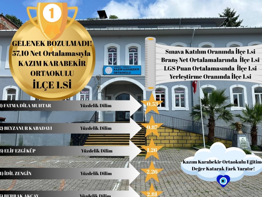 LGS sınavında okulumuz tüm derslerde ilçe 1. olmuştur. Bu başarının mimarı değerli öğretmenlerimizi, öğrencilerimizi ve velilerimizi kutlarız. Kazım Karabekiri Ortaokulunda okumak bir ayrıcalıktır.